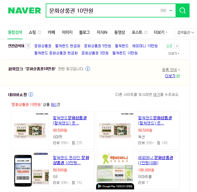 1. 네이버에서 "문화상품권 10만원" 으로 검색한다