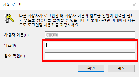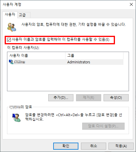 사용자 이름과 암호를 입력해야 이컴퓨터를 사용할 수 있음(E) 란의 체크를 해제하고 확인 버튼을 누릅니다.