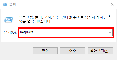 netplwiz 라고 입력하고 확인버튼을 누릅니다.