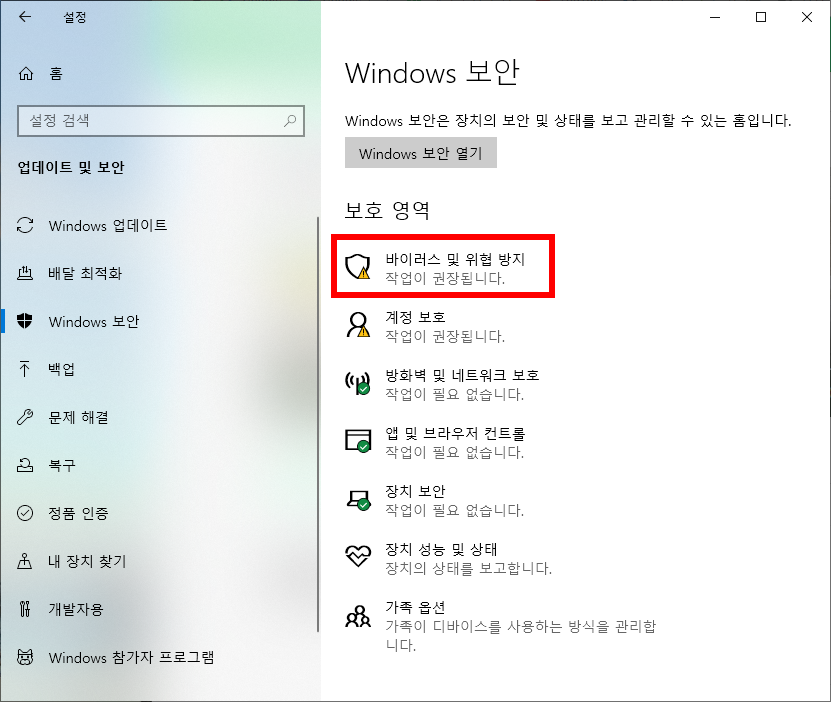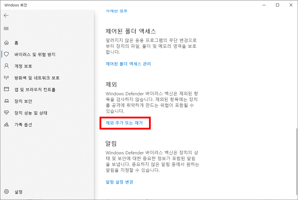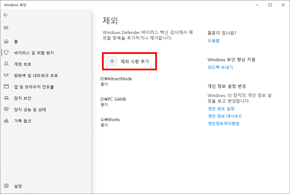 아래순서대로 하면 지정한 폴더나 파일은 검사 제외됩니다.