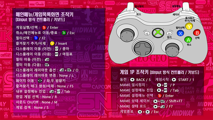 키는 키보드(1P)와 엑스인풋 방식의 조이패드/스틱(1P,2P) 기준으로 기본 세팅되어 있습니다.