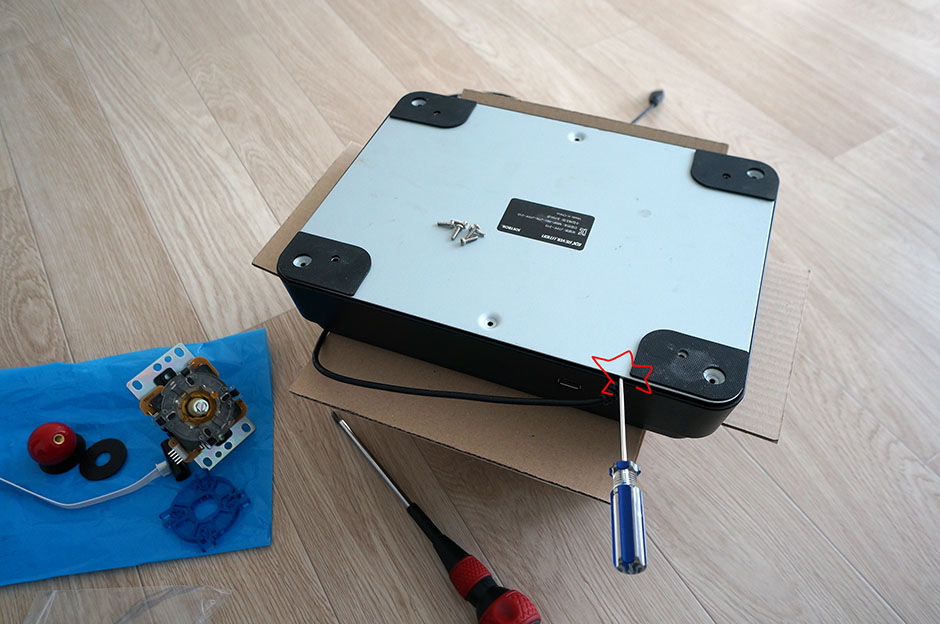 조이스틱을 뒤집어 철판에 있는 6개의 스크류를 풀어주고, 사진에 있는 빨간표시부에 일자 드라이버를 찍러넣어 지렛대원리를 이용하여 들어올리면 철판이 분리됩니다.