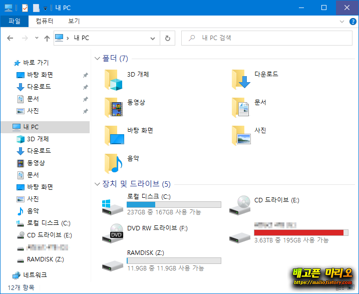 그리고 탐색기를 실행하면 내 PC의 드라이브 항목이 먼저 보이게 됩니다.