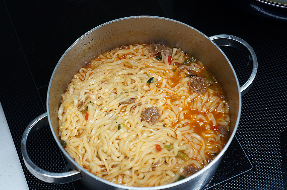 면과 분말스프,건더기 스프를 넣고 4분30초를 끊인다음,