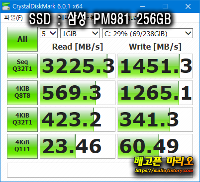 속도측정의 절대값은 시스템 사양이나 OS의 전원/절전설정, 메인보드 바이오스 설정값에 따라 차이가 있으니