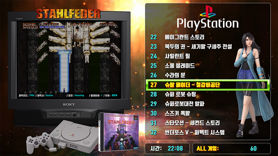 - 전체 지원게임 목록 증가 (2906개 → 3008 개) (플스1, PC 윈도우즈게임, 스팀, 기타.. 목록 추가) - 메인 프론트엔드 어트랙트모드 버전업 (v.2.5.1 → v.2.6.0 ) - 아케이드 에뮬용 EKMAME v.0.217 로 버전업 및 기타 에뮬레이터 버전업 - 2D 콘솔 에뮬용 MAME를 Mameui v.0.217 로 교체 - 플스1 한글패치 게임의 한글 표기 오류 정정 - 플스2 게임별 커스텀 에뮬세팅 적용 - 플스2 32메가 대용량 메모리카드 적용, 올캐릭 세이브 적용 - 플스3 게임별 커스텀 에뮬세팅 적용 (메탈기어 솔리드4, 조조의 기묘한 모험등) - 신규 테마 추가
