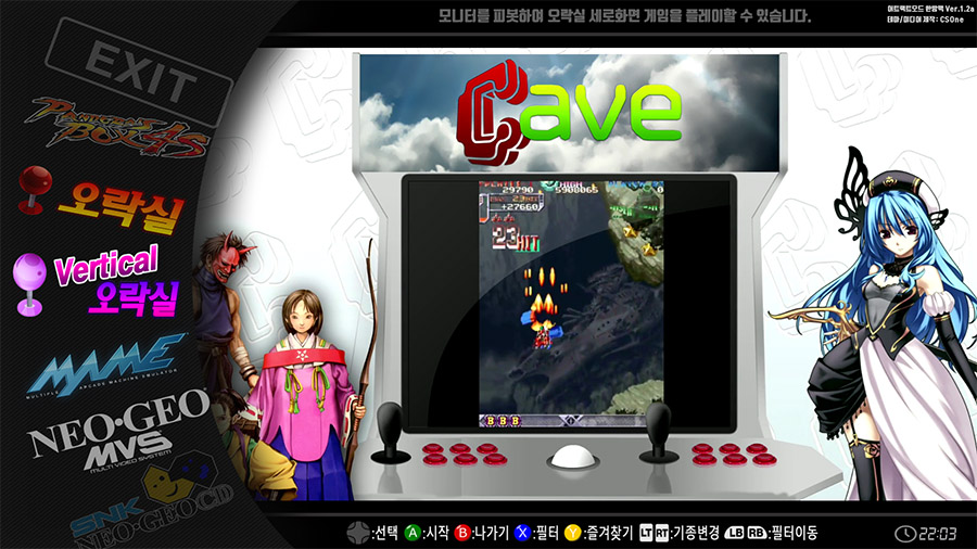 오락실 세로 슈팅게임용 버티컬 아케이드 테마 추가 (피봇 모니터용) 오락실 세로 슈팅게임용 버티컬 아케이드 테마용 커스텀 아트웍파일 제작/적용 - Zinc 코너 게임(철권류의 3D게임)의 실행 에뮬을 마메가 아닌 Zinc로 변경하여 다시 3D로 실행가능 (오락실,마메 코너에서는 Zinc게임이 2D기반의 EKMAME로 실행됩니다) - NDS 게임중 일부 세로회전 게임실행시 오류 정정 - NDS 게임중 세로회전 게임실행시 마우스커서가 자동 회전되도록 설정 반영 - WiiU 에뮬인 Cemu 1.16.1 최신버전 적용 및 Cemu hook 적용 (스위치 조이콘/프로콘 사용가능) - WiiU 일부게임 실행오류 정정 - 테마 즐겨찾기 기능개선 (즐겨찾기로 지정한 게임은 목록에서 ★ 모양 마크가 표시되도록 적용하여 시인성 향상) - 일부 오입력된 게임DB 정정 및 실행오류 정정 - 그외 1.1 버전 이후의 부분 업데이트된 내역들 모두 반영