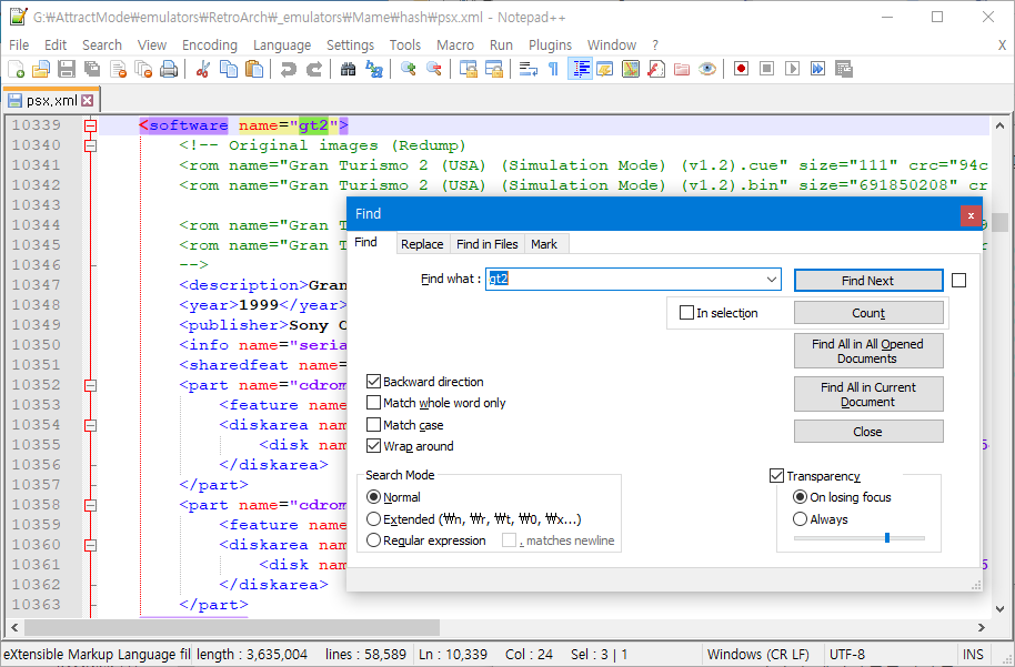 예를 들어 플스1을 검색하고 싶다면 psx.xml 파일을 읽어서 아래사진과 같이 검색할 수 있습니다.