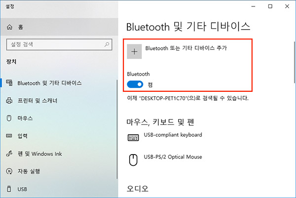 윈도설정>장치>Bluetooth및 기타 디바이스 항목을 선택한후, + 버튼을 눌러 장치를 추가해 줍니다.