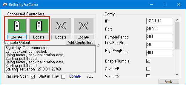 조이콘을 회전하려면 빨간박스안을 클릭하면 회전된 가로모드로 작동이 되며, 오른쪽의 Config 창에서 진동유무와 AB, XY버튼의 순서 반전 등 잡다한 기능을 설정해 줄 수 있습니다.