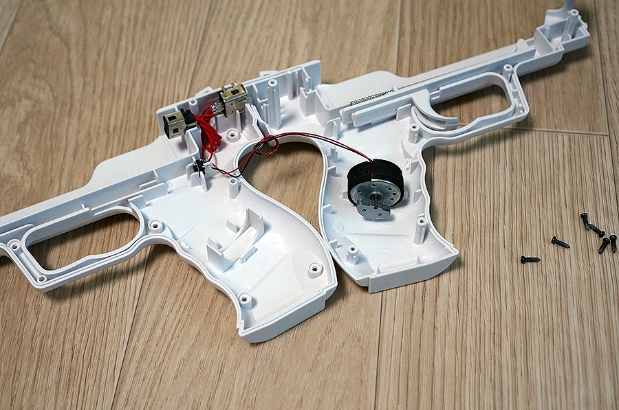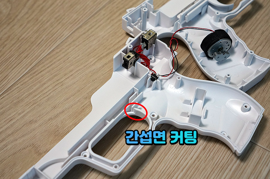 진동모터에 작은 마이크로 스위치가 달려 있는걸 아래 사진에서 확인할 수 있는데요. 레버를 당기면 레버부품이 이 마이크로 스위치를 누르는 방식인데 간섭면 때문에 스위치가 제대로 눌리지 않는 문제가 있습니다.