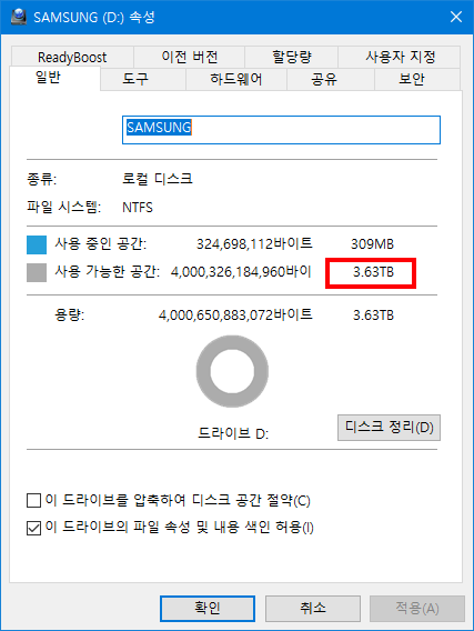 실제 사용가능한 용량은 3.63TB 입니다.