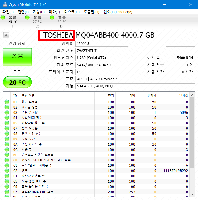 하드를 처음 사용할때는 항상 문제여부를 확인하기 위해 스펙확인과 속도테스트를 하고 있습니다.