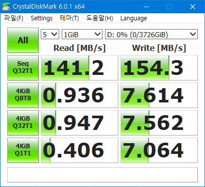 일반적으로 2.5인치 소형 외장하드는 3.5인치에 비해 속도가 느린편인데, 테스트 결과상으로는 왠만한 3.5인치보다 더 빠르네요. 4K 소형 파일의 읽기속도도 상당히 양호합니다. (일반적인 타사모델의 경우 0.5~0.7MB/s 수준)