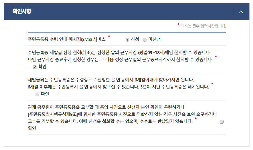 수령 안내 메시지(SMS)서비스 항목은 신청에 체크를 해줍니다.