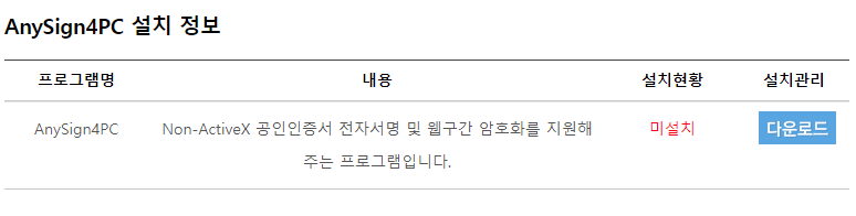 기존에 보안프로그램이 없다면 위와 같이 설치하라는 메세지가 나옵니다.