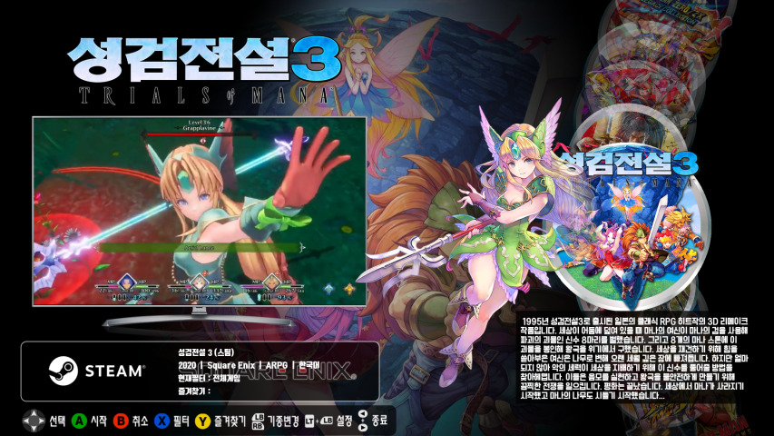 아주아주 오래전 슈퍼패미컴으로 발매됬던 액션 RPG 게임 성검전설3가 3D 그래픽으로 완전 탈바꿈하여 리메이크작품으로 돌아왔습니다. 닌텐도 스위치, 플레이스테이션4, PC 스팀 버전으로 모두 출시되었죠. 특히 PC에서는 가장 뛰어난 퍼포먼스로 게임을 즐길 수 있습니다.