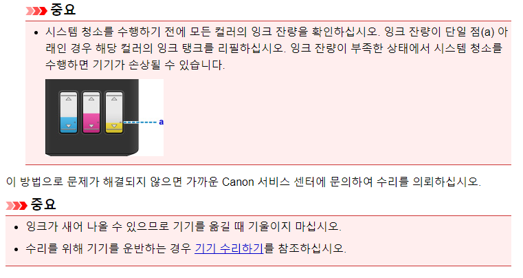 시스템 청소는 약간의 시간이 걸리며 특히 다량의 잉크를 소모하므로 잉크잔량이 충분해야 합니다.