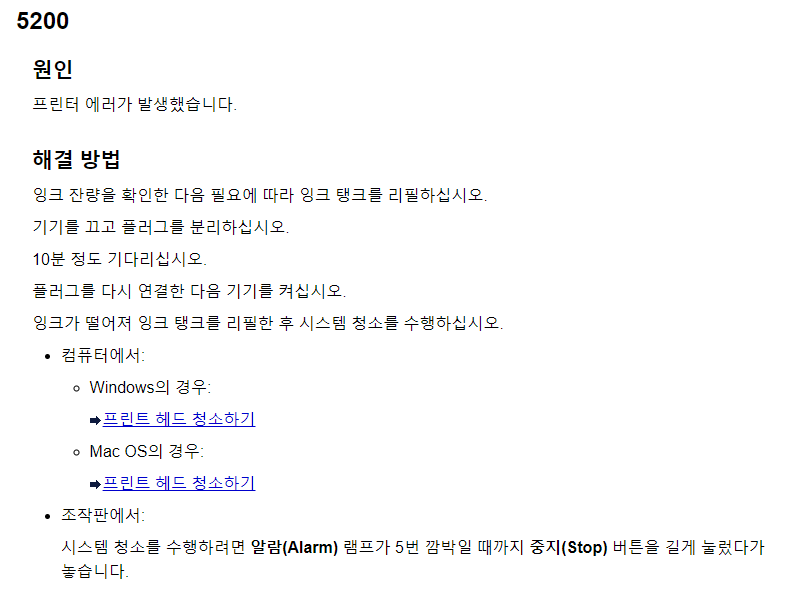 에러 발생시 일단 프린터 전원을 끈 다음 조금 있다가 다시 켭니다.