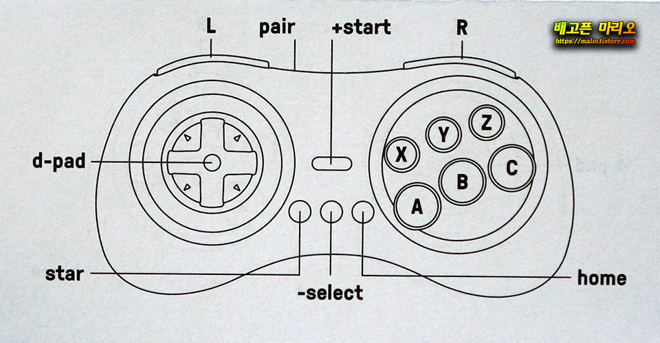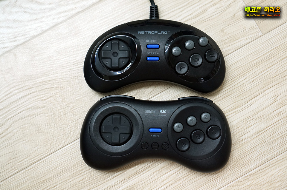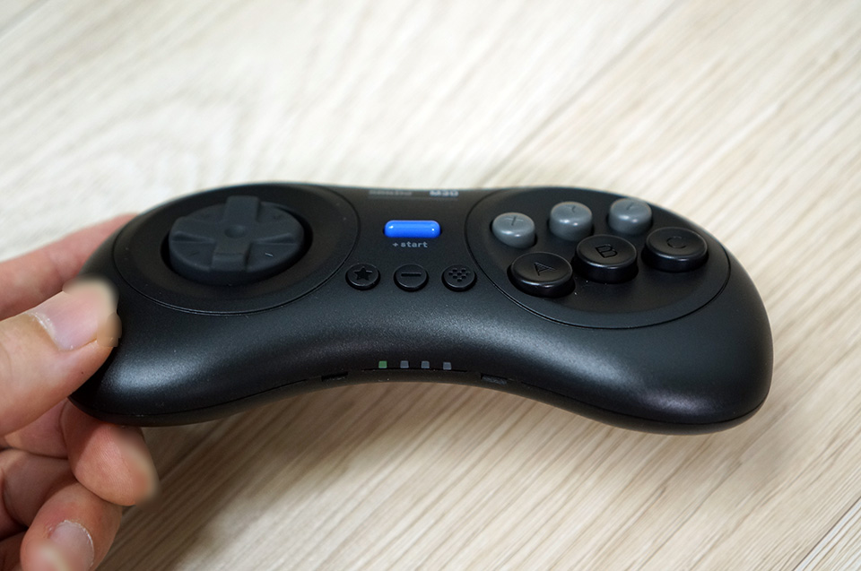 제품외관입니다. 세가의 오리지날 메가드라이브 6버튼 패드를 연상시키는 디자인이라서, 기존에 제가 쓰던 레트로플래그사의 메가드라이브 유선 6버튼패드와 아주 유사합니다. 손에 딱 감기는 모양새입니다.