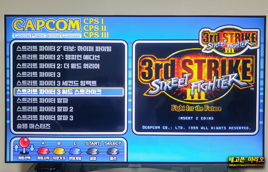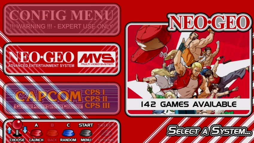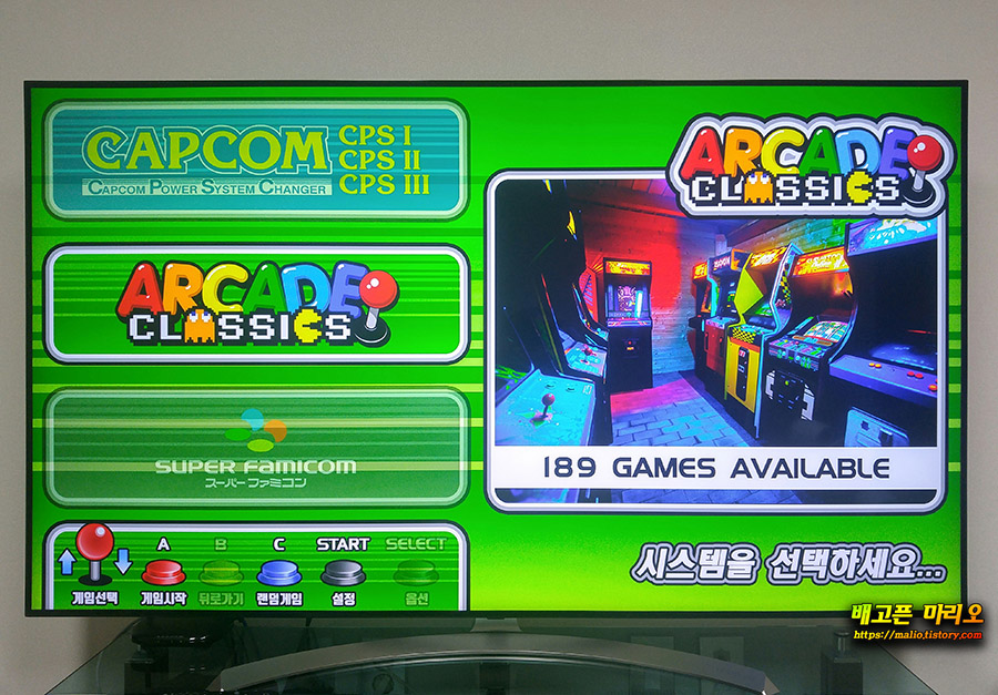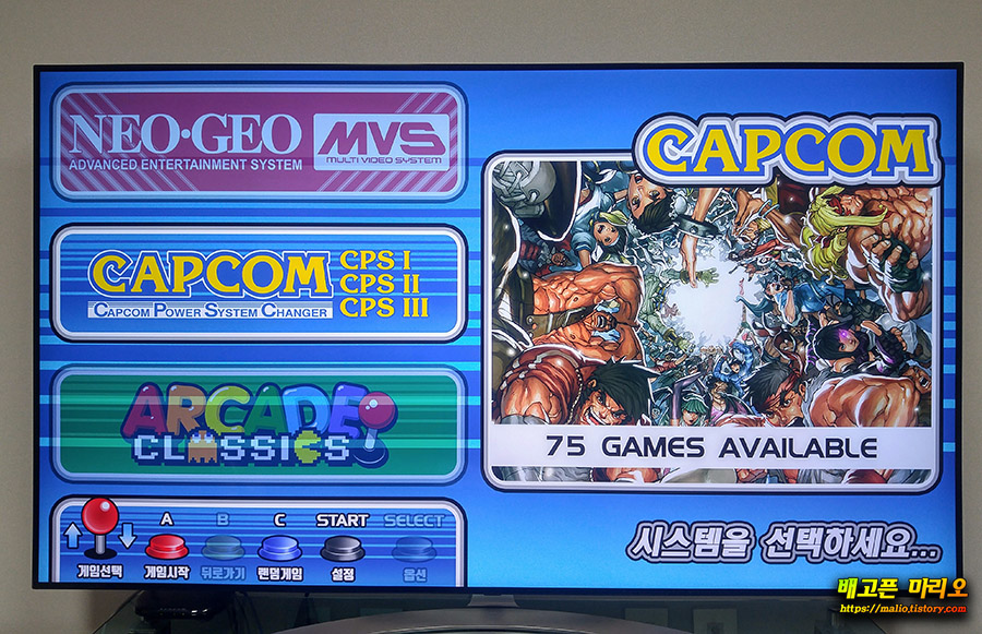 기존 테마(youtu.be/NZbS94vRLYo)는 아래 사진과 같이, SNK 네오지오 게임과 캡콤의 CPS기판 게임 이렇게 2가지 종류만 지원하고 있었고, 용량도 8기가 메모리로 충분할 정도였는데요.
