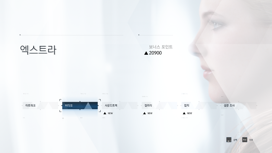 스토리를 진행하면서 포인트를 얻을 수 있는데요. 엑스트라 메뉴에서 이 포인트를 사용하여 미공개 동영상과 아트웍, 각종 데이타들의 잠금을 해제할 수 있습니다.