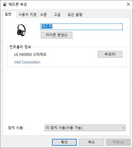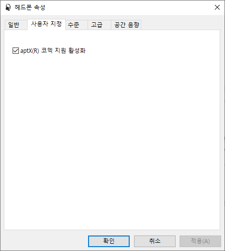 사용하는 이어폰이나 헤드폰 모델에 따라 설정창은 달라질수 있겠지만, 대략 아래와 같이 속성창의 사용자 지정항목에 기존에 없던 aptX 지원 활성화 기능이 추가된 것을 확인할 수 있습니다.