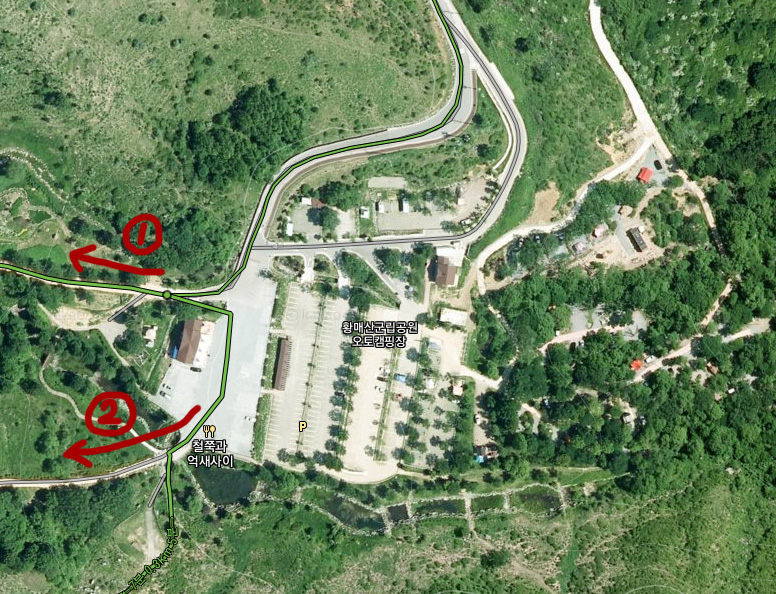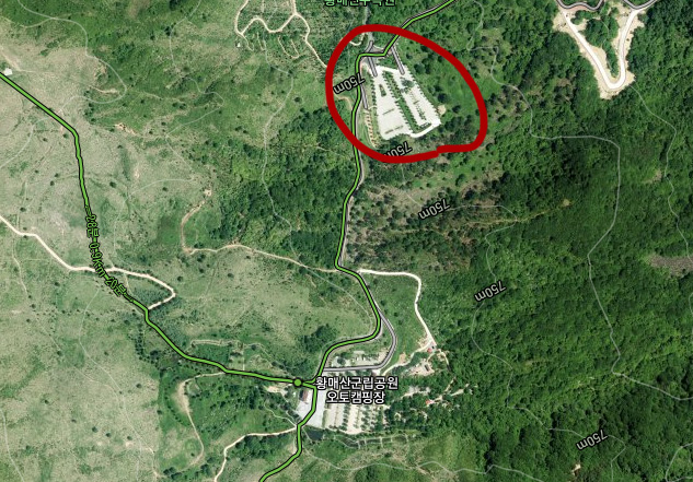 그렇기 때문에 차라리 아래 사진의 동그라미 친 부분의 아래쪽 주차장을 이용하는것이 더 나을수도 있습니다. 아래쪽 주차장에서 최종 주차장(황매산군립공원 오토캠핑장)까지는 700미터 정도만 걸으면 됩니다.