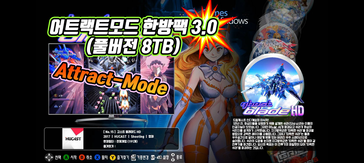 어트랙트모드 한방팩을 오랜만에 버전업을 해보았습니다. 그동안 라즈베리파이4 가지고 노느라 어트랙에는 시간투자를 못했었습니다. 생각했던 것들을 몇가지 적용해 보았습니다. 결과적으로 개인적인 만족도는 좋습니다.
