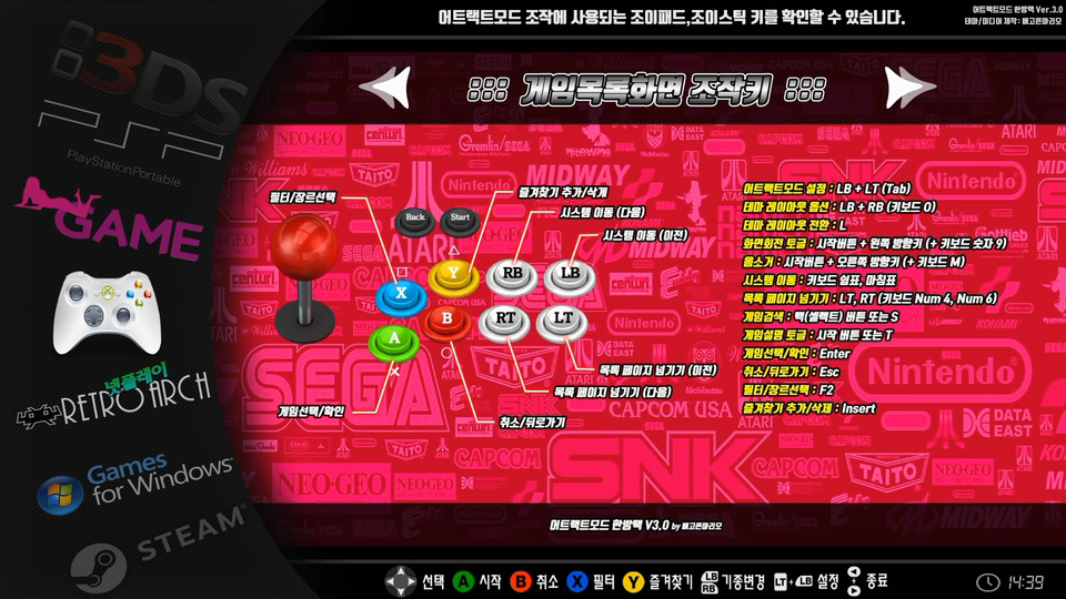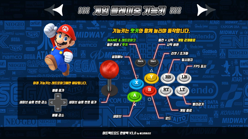 컨트롤러 테마는 어트랙트모드 한방팩을 실행하면서 사용하게 되는 기본적인 기능키와 단축키들을 한눈에 알아볼수 있도록 디자인을 새롭게 구성해 보았습니다.