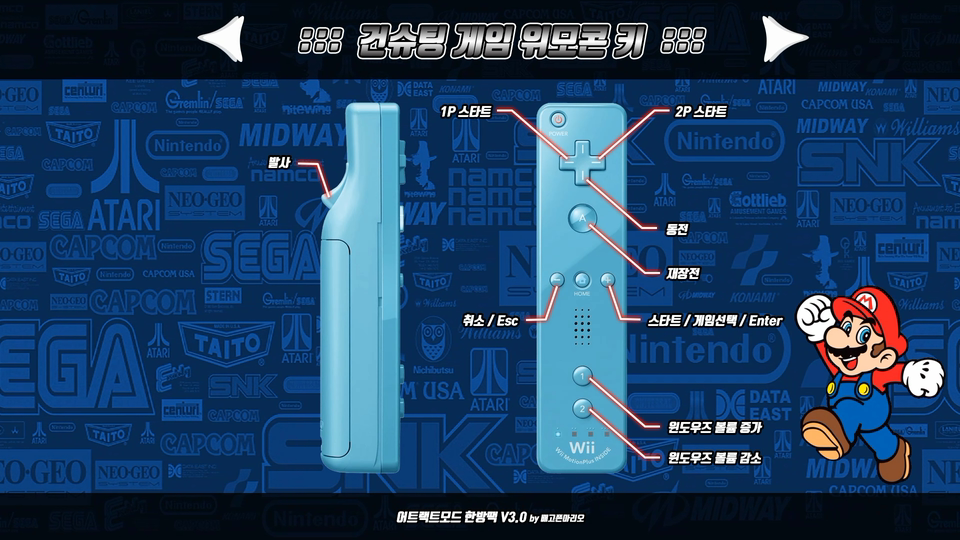 건슈팅 테마는 말 그대로 건슈팅 게임을 위한 테마인데요. 비싼 건콘이나 비교적 저렴한 위모컨을 이용하여 동시 2인용이 가능토록 세팅해보았습니다. 대형 오락실에서나 할수 있었던 건콘게임을 집에서 둘이서 즐길수 있다는게 큰 메리트가 아닐까 합니다.