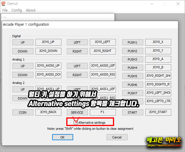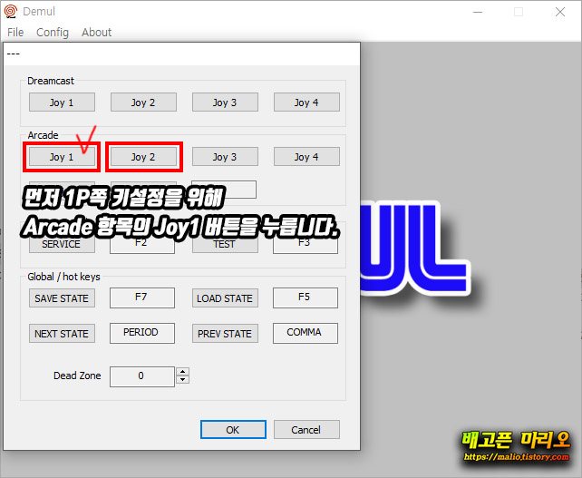 장치인식이 되었으니 이제 실행하는 에뮬레이터에서 키설정을 해줄 차례입니다. 오락실 아토믹스웨이브 기판과 세가 나오미 기판의 게임을 구동시켜 주는 데뮬 에뮬레이터에서의 키설정 방법입니다.
