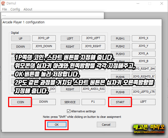 그러면 새로운 키 설정화면이 나오는데요. 여기서 동전버튼과 스타트 버튼에 키값을 입력해 줍니다. 저는 동전에 위모컨의 아래쪽 방향키를, 스타트 버튼에는 왼쪽 방향키를 지정해 주었습니다.