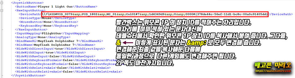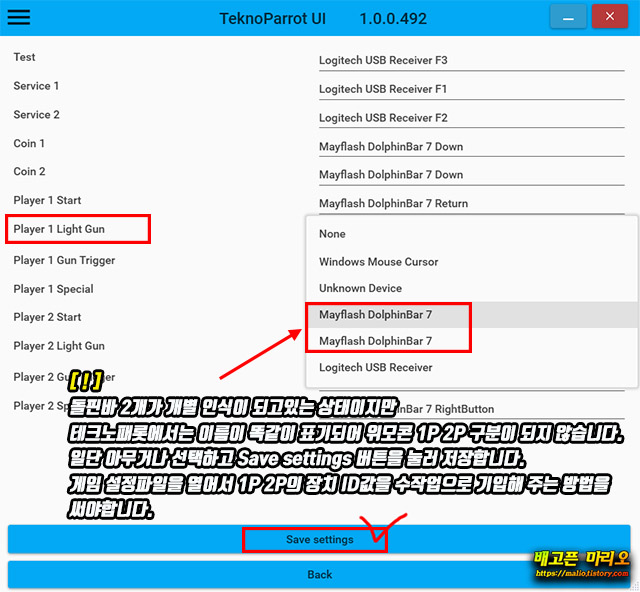 잘 보면 Mayflash라고 뜨는것이 돌핀바에 연결된 위모컨을 뜻하는것인데요. 제 사례를 보면 Mayflash DophinBar 7 이라는 항목이 똑같은 것이 2개 뜨는 것을 알 수 있습니다. 어느것이 1P이고 2P인지 구분이 불가능합니다. 일단은 아무거나 선택을 하고 저장하십시오. ← ★테크노패럿 최신버전에서는 1P 2P 장치값이 구분이 됩니다. 그러므로 그냥 직접 키지정하면 됩니다. 과거처럼 수작업으로 XML 파일에 장치 ID 값을 넣어줄 필요가 이젠 없습니다.