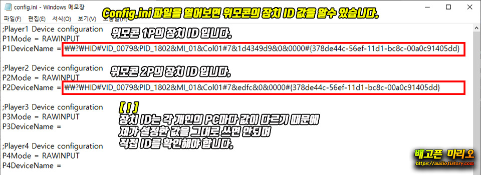이제 장치 설정이 끝났으니 아주 중요한 1P측과 2P측 장치의 ID값을 확인할 차례입니다. 이 ID값은 테크노패롯 게임의 건콘 키설정시 필요합니다. 그러니 메모장에 복사해서 보관해 주세요. ← ★테크노패럿 버전업으로 인해 이제 이작업은 필요치 않습니다.(2021.02.07 수정)