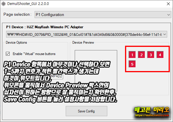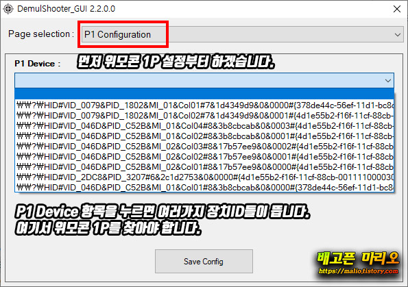 1P쪽 설정이 끝나면 Save Config 버튼을 눌러 저장을 합니다. 그리고 나머지 2P쪽도 동일한 방식으로 진행한 후 저장하면 됩니다. 다만 2P쪽 설정시 1P로 이미 설정했던 위모컨이 다시 선택될 수 있으니 이점 유의해서 장치를 중복되지 않게 잘 선택하면 되겠습니다.