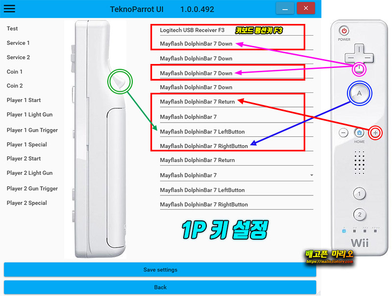 2P쪽도 동일한 과정을 거치되 동전 버튼은 위모콘의 방향키 오른쪽을 지정해 줍니다. 발사,재장전 버튼은 앞서 설정한 데뮬슈터 유틸이 자동반영하므로 따로 해줄것은 없습니다.