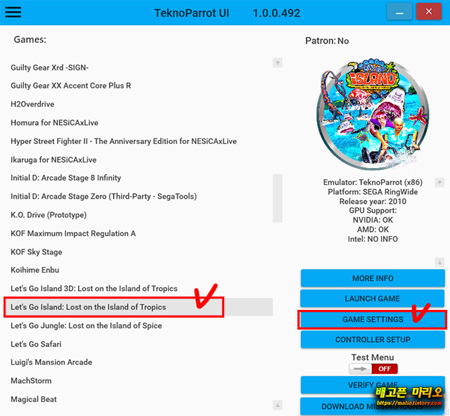 아래 사진과 같이 리스트에서 렛츠고 아일랜드를 선택한 다음, 우측에 있는 GAME SETTINGS를 클릭합니다.