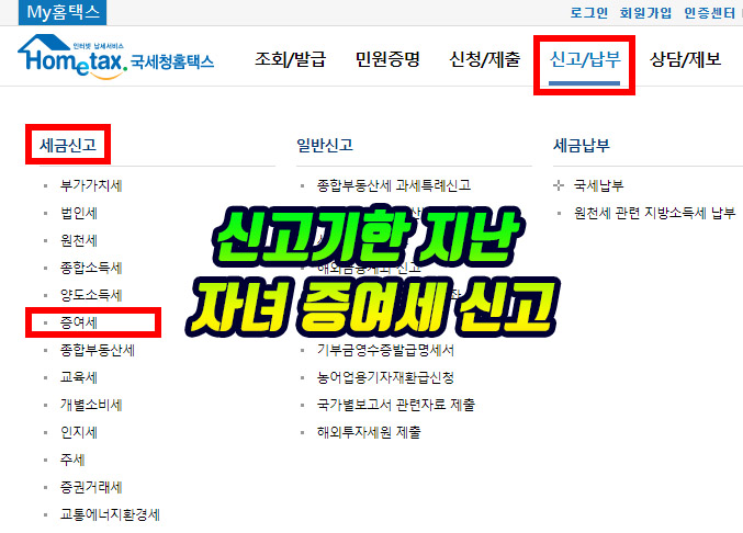 사이트 메뉴에서 신고/납부>세금신고>증여세>일반증여신고를 순서대로 클릭합니다.