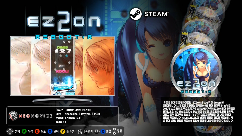 요즘 국산 리듬게임중 인기가 있는 디제이맥스 리스펙트 V, 그리고 이지투온 리부트 R 게임의 어트랙트모드용 미디어팩을 만들어 보았습니다. 미디어팩에는 휠 아이콘, 미리보기 비디오영상, 배경이미지, 게임설명파일이 모두 들어있습니다.