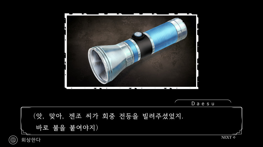 게임은 1장~ 11장으로 구성되어 있고 마지막 11장에는 토굴 미로를 탐색하는 곳이 있는데, 처음에는 어두워서 아무것도 안보입니다. 메뉴에서 [회상한다]를 선택하면 손전등을 사용하기 시작하고 화면이 제대로 보이게 됩니다.