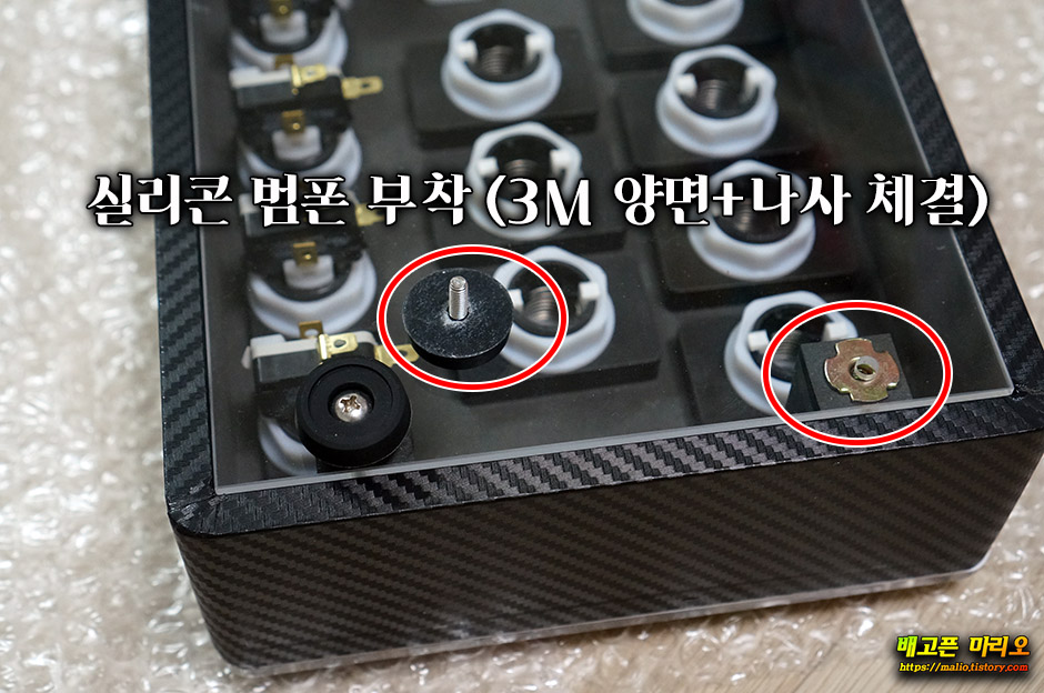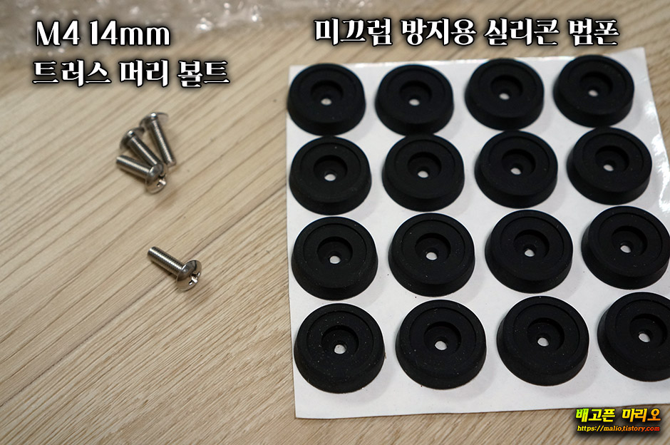 3M 양면테입이 붙어있어 그냥 접착해도 되지만 하판 고정을 위해 범폰 중앙의 홀에 M4 규격의 길이 14mm 트러스 머리 볼트를 체결해줍니다.