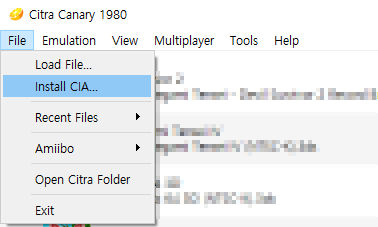 일반적으로 한글패치 파일이 확장자가 cia 파일하나로 팩키지화 되어 있을 경우에는 간단하게 File 메뉴에서 Install CIA 를 선택하여 한글패치 파일을 선택해 주면 설치가 되어 한글이 적용됩니다.