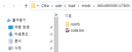 이 폴더창안에 romfs폴더로 구성된 한글패치 파일/폴더들을 넣어주면 한글 적용이 됩니다.