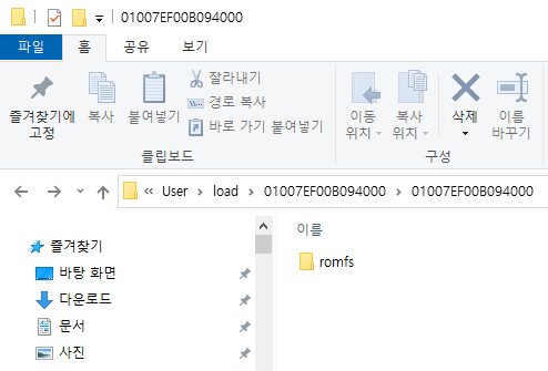 즉, 타이틀ID 폴더안에 romfs 폴더/파일이 들어가는 구조가 됩니다.