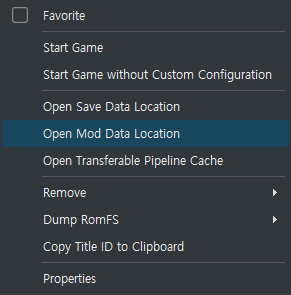 게임목록에서 패치를 원하는 게임을 선택한 다음, 마우스 우클릭하여 Open Mod Data Location 을 선택합니다.