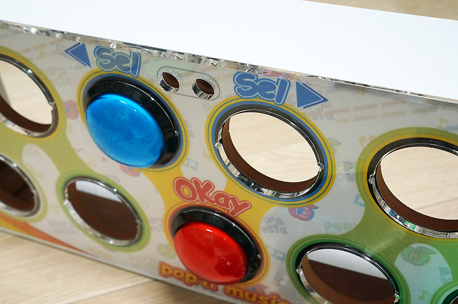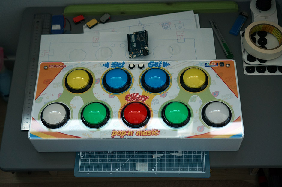 PC용으로 사용할 목적이기 때문에, 내부 PCB는 아두이노 레오다르노를 사용하여 키보드 방식으로 입력되도록 하였습니다. 입력키는 코나미에서 정식 서비스중인 팝픈뮤직 라이블리의 키세팅을 적용하여 키변경 과정없이 선만 연결하면 바로 사용할 수 있도록 하였습니다. 또한 키보드 방식이라 다른 에뮬게임에서도 손쉽게 사용이 가능하다는 장점이 있습니다.