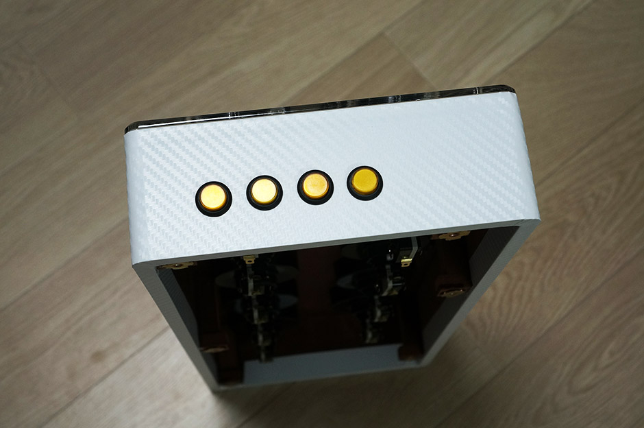 위치확인후 상단의 좌우측홀에 고정용 스크류를 박아서 아크릴을 고정해준다음, 버튼을 장착해 주었습니다.