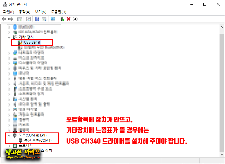 아래사진과 같이 기타장치에 느낌표가 뜨면서 포트번호를 알수가 없게 됩니다.