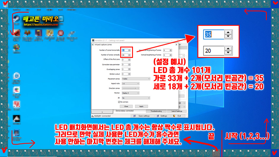 가로 led 개수는 33개이지만 모서리 공란을 포함하여 35개로, 세로 led 개수는 18개이지만 모서리 공란 포함하여 20개로 해 주었습니다.